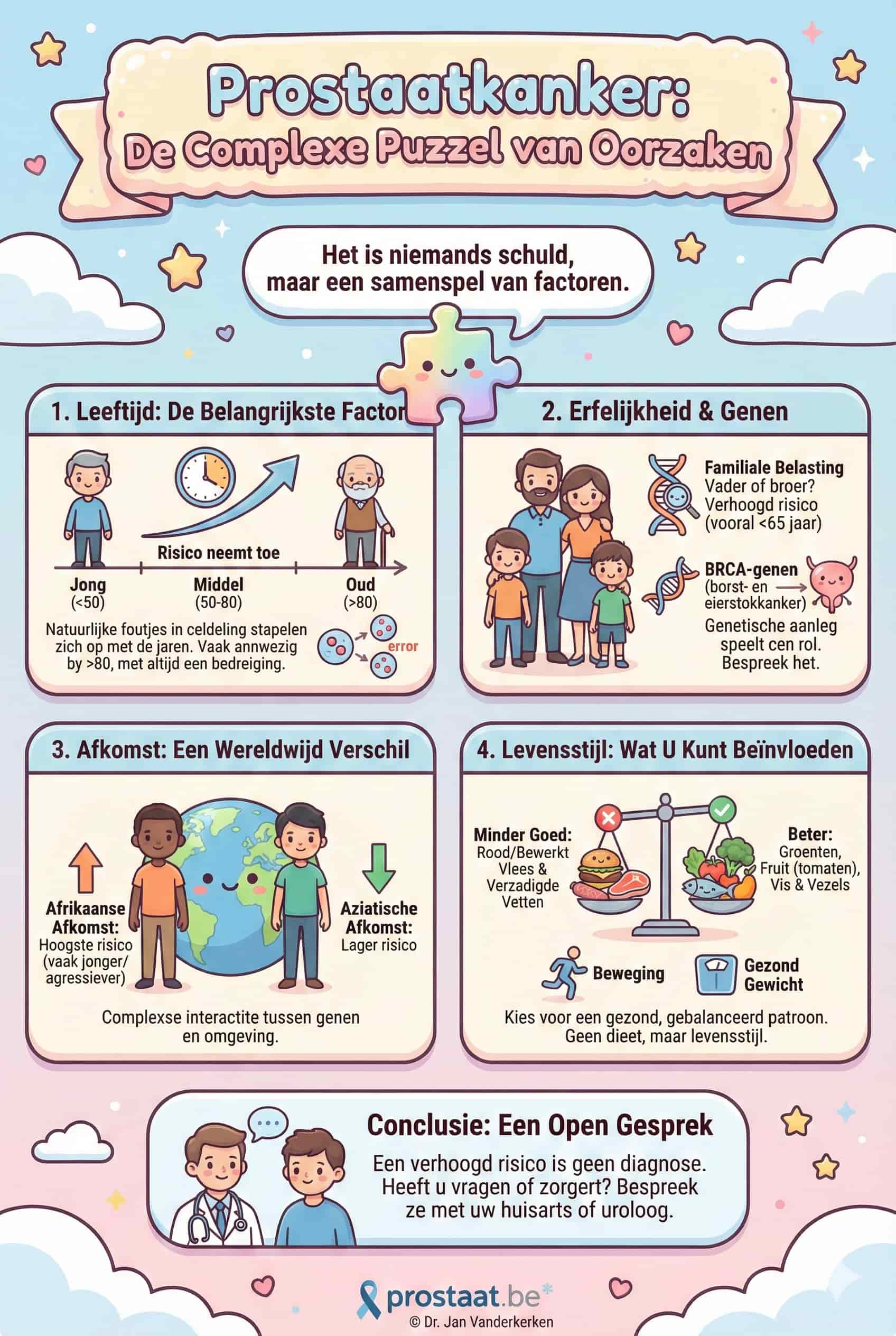 Ontdek de oorzaken van prostaatkanker in deze heldere infographic. Leeftijd, erfelijkheid, afkomst en levensstijl spelen een rol. Een verhoogd risico is geen diagnose; bespreek zorgen met uw arts.